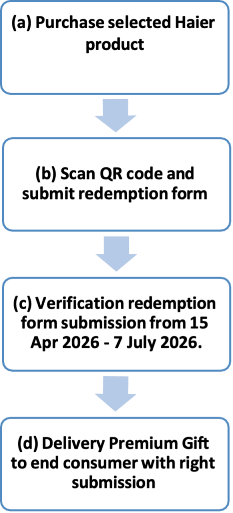 - Every purchase of the selected Haier Product is entitled for one (1) free gift as stated below (“Free Gift”) and is subject to limited available quantity (unit) for redemption based on first come first serve basis.